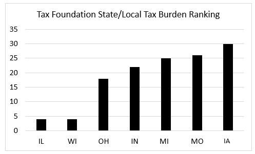 The chart below shows the rankings for Illinois and six Midwest neighbors (Indiana, Iowa, Michigan, Missouri, Ohio, and Wisconsin) on a “Tax Burden” measure compiled by the Tax Foundation. This measure is valuable in part because it adds taxes at both state and local levels, as a share of state personal income (many states differ in the share of taxes at state and local levels). Illinois and Wisconsin are tied for the 4th “highest” ranking (the highest burden) in the 50 states in the nation – and significantly higher than their neighbors.