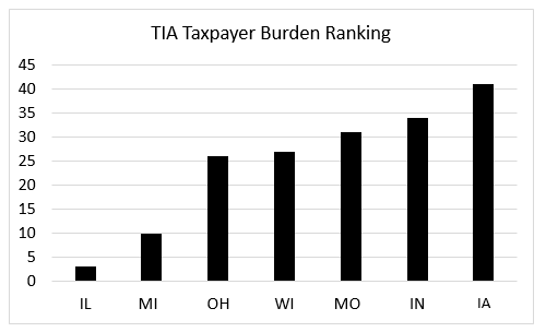 Illinois ranks among the five “worst” (highest) states on our Taxpayer Burden, significantly higher than most of its neighbors.