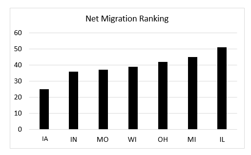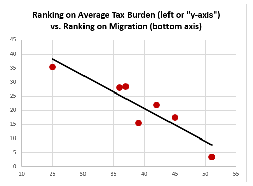 In turn, the chart below relates those seven states’ rankings on migration to their rankings on the average “Tax Burden.” There is a pretty tight relationship – states with higher tax burdens are also enduring significant outmigration – even within the Midwest.